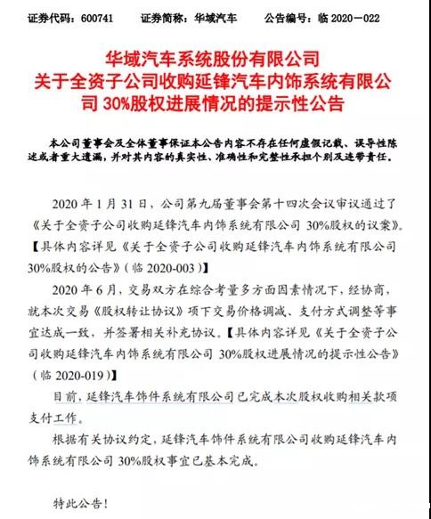 华域汽车在此次公告中称,目前延锋公司已完成本次股权收购相关款项支付工作。根据有关协议约定,延锋公司收购延锋内饰30%股权事宜已基本完成。